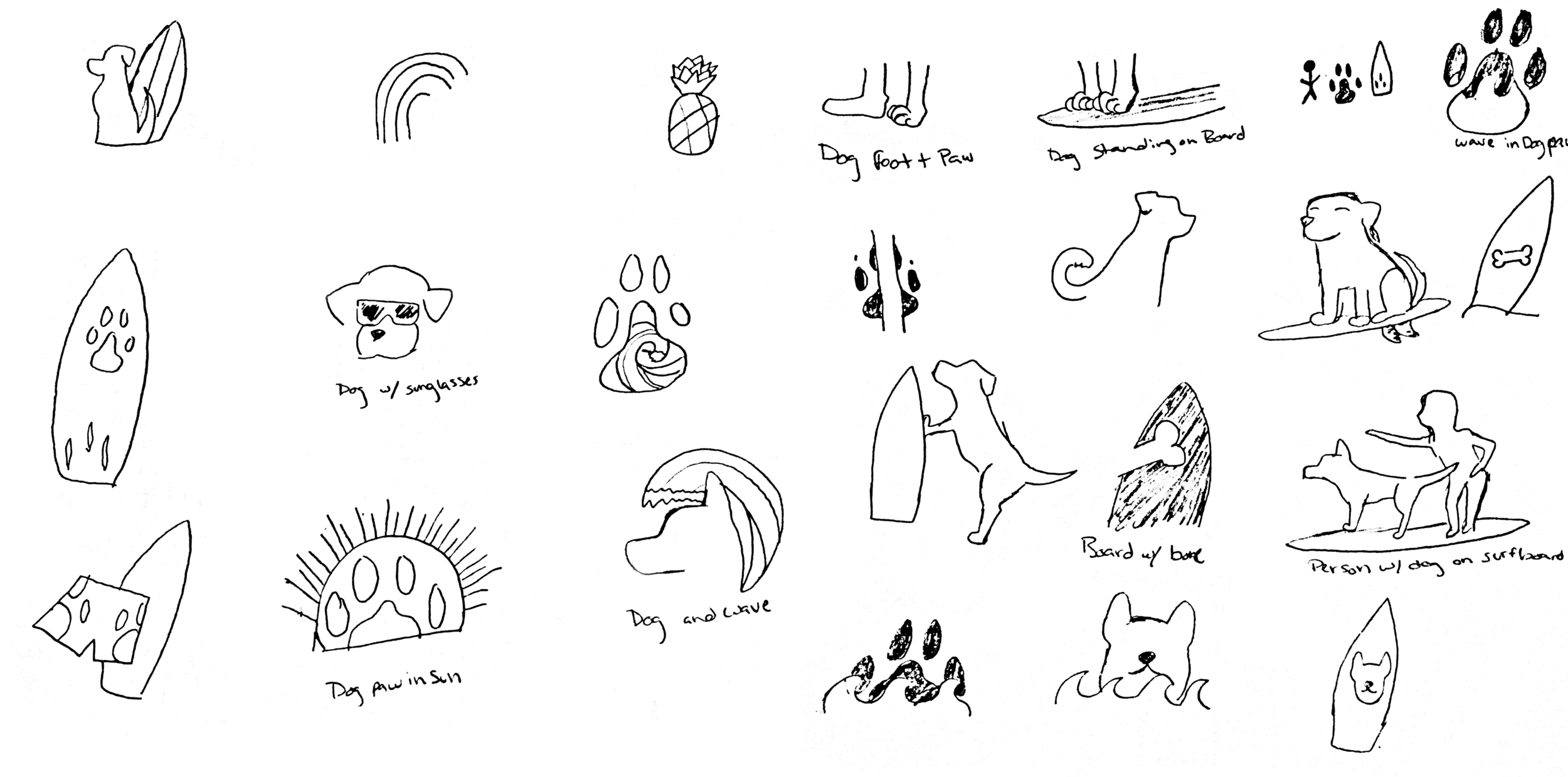 At one point I wanted to integrate the sun but it did not feel right. This is the kind of logo that is going to start a culture and people are going to want to represent the brand. I tried sketching out some paw prints but it felt overdone. I thought a paw print on a surfboard would really get the point across but it did not look quite right. A paw print with a wave inside would look interesting.
